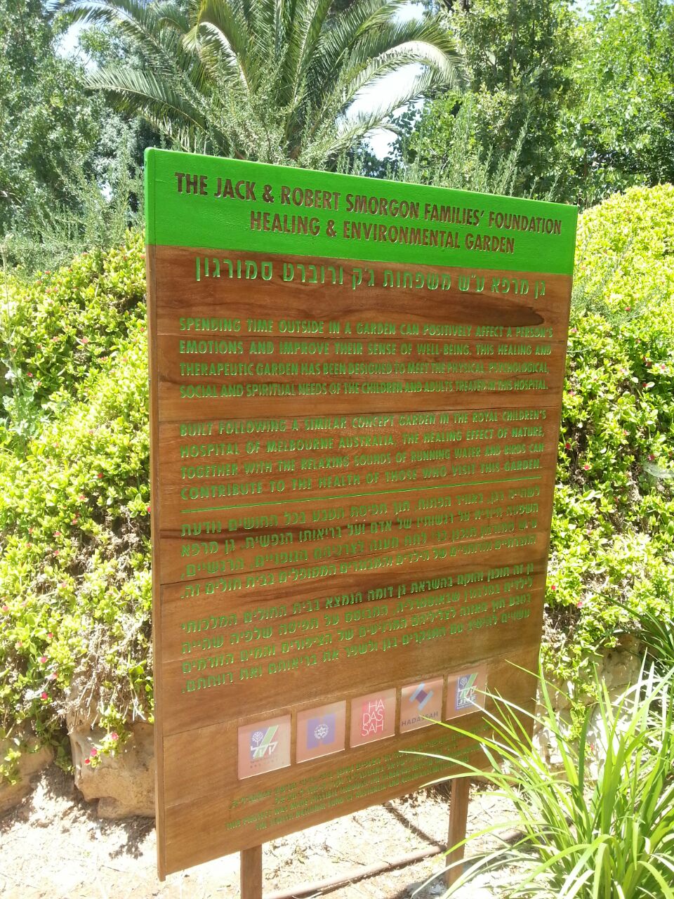 הגן הטיפולי מייצג גישה מתקדמת בטיפול בילדים ובצעירים הסובלים ממחלות כרוניות. התכנית מבוססת על גינה טיפולית בבית החולים לילדים במלבורן אוסטרליה. הגינה המטופחת כוללת מדשאות ירוקות, ערוגות פרחים, גן ירק, צמחי מרפא, טיילת עץ, מרפסת תצפית, סככת טיפולים ואמפיתיאטרון קטן, שבו גם נערך טקס חנוכת הגן.